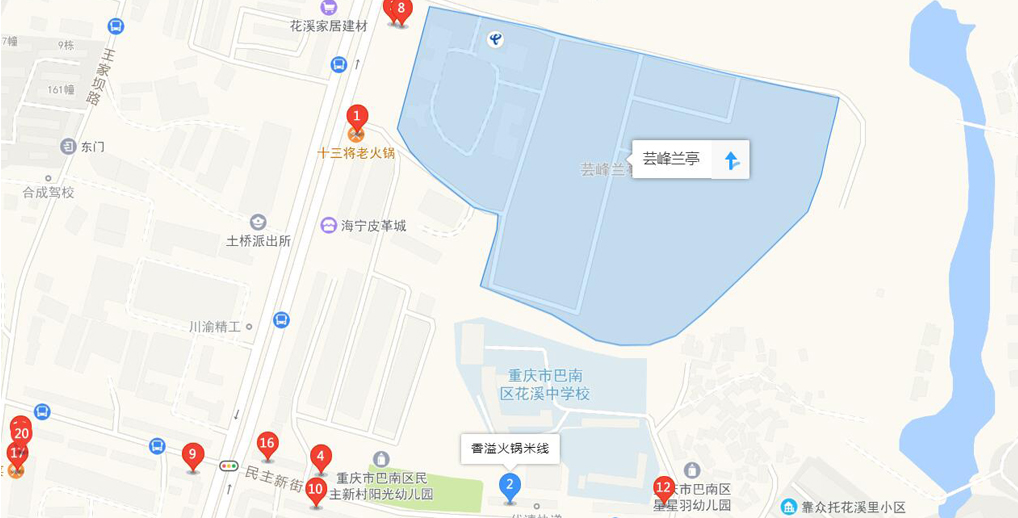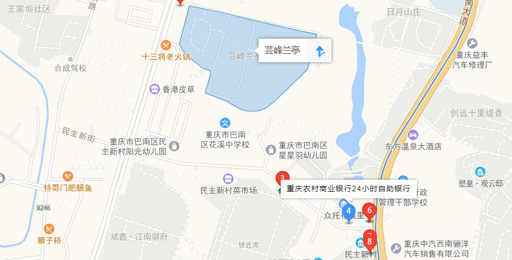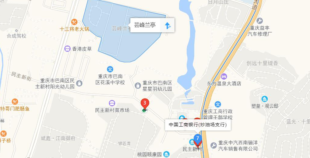 芸峰·兰亭位于重庆市巴南区渝南分流道,李家沱片区核心,东临日月山庄小区,接渝南大道,轻轨3号线,南临民主新村小学和市政公园,遥望南山,集山景,公园为一体,具备良好的居住环境。